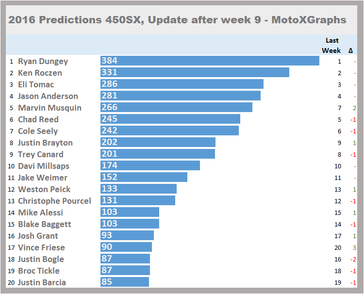 The major mover in this week's predictions is Marvin Musquin, from 7th up to 5th. It took another great result from Musquin combined with a DNF from Chad Reed. Otherwise it's a fairly tame update to the 450SX predictions. Ryan Dungey remains a prohibitive favorite, and for the first time no one falls out of the Top 20 from last week.