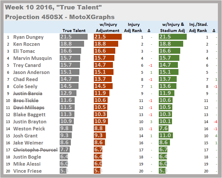 Last week's breakdown here. For Week 11 heading into Detroit, we see the standard top 3 again -- Dungey / Roczen / Tomac -- in the True Talent estimation. Marvin Musquin makes a move in this projection, too. He's now projected as the 4th most talented rider, alhtough his prediction remains volatile since we're dealing with less than a full season of 450SX results for him. As we factor in injuries in the red column, Trey Canard slips down a ranking spot, as does Chad Reed.