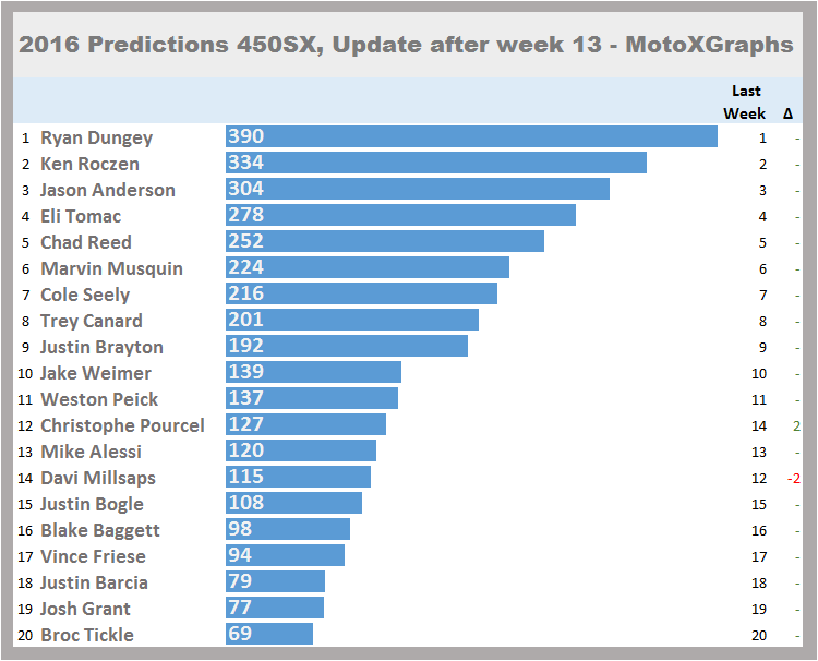 After we apply the injury and stadium adjustments, the order is Dungey / Roczen / Anderson / Canard / Tomac, followed closely by Reed, with Musquin and Seely not too far behind that. Just eyeballing it, Pourcel seems really low, but the numbers are taking into account his first half of the season, which was pretty mediocre.