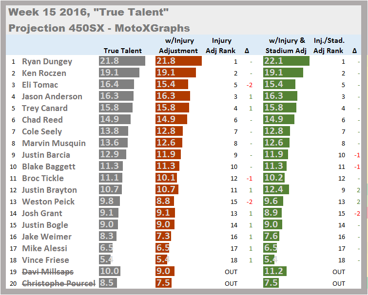 After we apply the injury and stadium adjustments, the order is Dungey / Roczen / Anderson / Canard / Tomac / Reed again, with a fairly decent-sized gap between them and the next riders -- Seely, Musquin, Barcia, and perhaps Brayton (see below on Brayton). Poor Justin Bogle is still way down the list, despite his good result last week; he needs more than one result to make a move in the predictions (well, more than two, apparently, since he's had a 6th and a 4th, sandwiching a 13th, over the past three weeks). Rookies with little track record are harder to predict, though my guess is that the numbers are too low on him, not factoring in the likelihood that he's growing accustomed to 450 Supercross and has improved his ability compared to weeks 1 thorugh 7, where his best result was 13th.