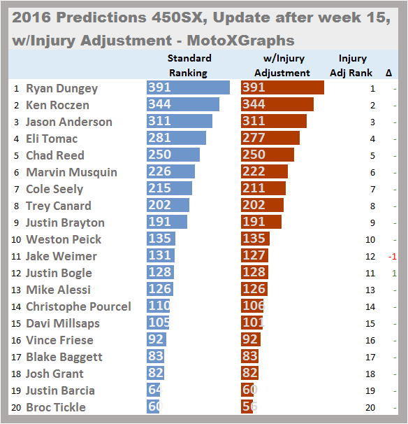 After we apply the injury and stadium adjustments, Dungey and Roczen are again at the top at 1 and 2.  They're followed very closely by Tomac, then Anderson, Canard, and Reed.