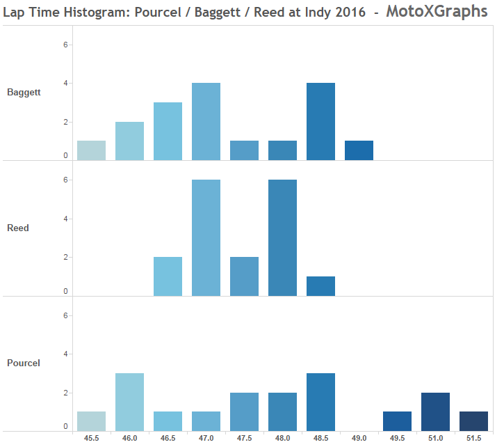 Blake Baggett's distribution seems fairly normal: a few laps in the 46 seconds and under range, which was pretty fast for Indy, and he's got some slower laps, 5 of which were at 48.5 seconds and above.  Chad Reed, though has an amazingly consistent set of lap times, all falling within a range of about 2 seconds.  Pourcel, on the other hand, has several fast laps, like Baggett, in the 46 seconds range, but he also has 4 laps way to the right on the histogram -- laps that were 49.5 seconds and above.  Those were laps 15 through 18 for Pourcel, and he was passed by Baggett on Lap 15 and by Reed on Lap 18.  Now the laps before and after that matter, too, but if Pourcel was able to keep it in the 49 seconds or below range during those laps, maybe he holds off Baggett and Reed for an even better finish.