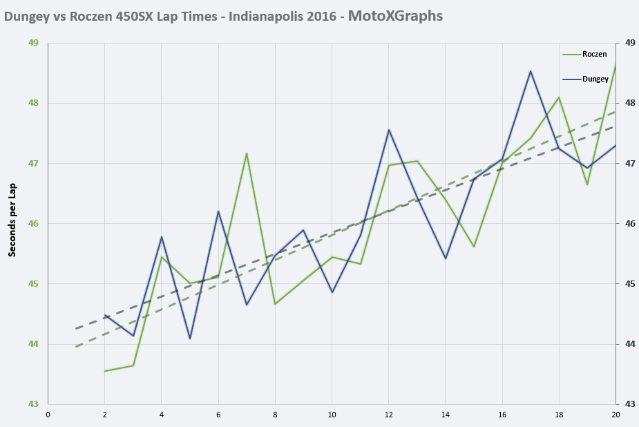 Well, the fastest lap put up by any of the other riders was by Eli Tomac, who logged a 44.836 in his second lap (Trey Canard had the next fastest, at 45.212 in Lap 5, and Jason Anderson was next after that at 45.503).  Together, Dungey and Roczen had 7 laps faster than Tomac's fastest!  That means the 7 fastest laps out of all the riders in the Main Event were from Dungey (4 of them) and Roczen (3 of them).  (Excluding Lap 1 from any of this.)