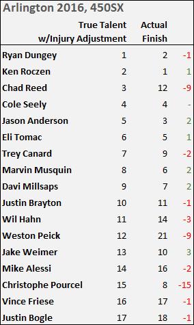 That is a good segue into the race predictions, where I felt the numbers gave a good forecast, except for Reed (my claim of not liking Reed at #3 here). Of course the big misses were in the Top 3, which is a bit of a problem: Roczen actually getting the win and Reed finishing outside the Top 10. Other than that, though, it looks pretty good -- no other rider in my Top 10 is off by more than 2: