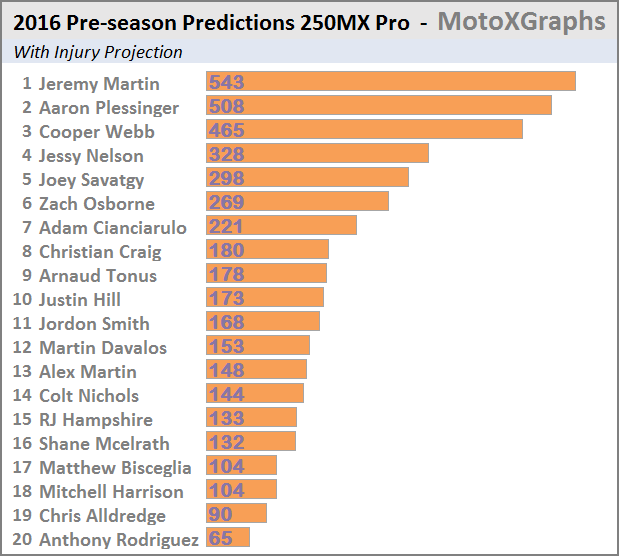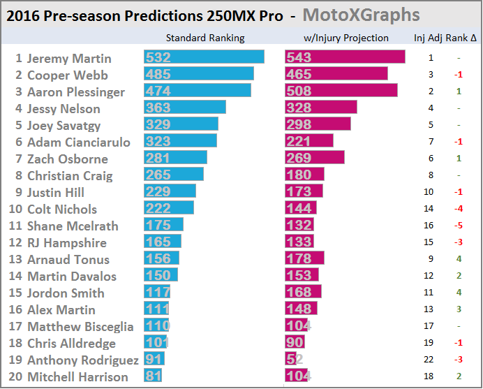 The 250 predictions with the injury adjustment have a little more of a shakeup than the 450's: