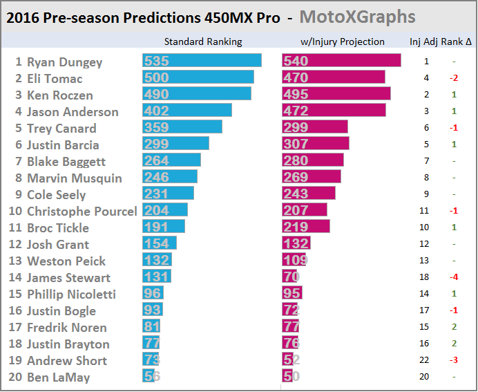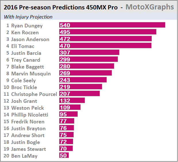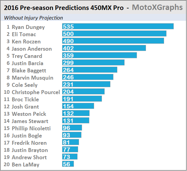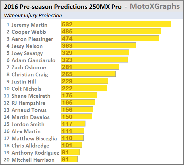 Well, I'm excited, anyway. For each of the classes there are two projections: one that pretends no one will get injured -- in order to look at the estimated true talent, and one that factors in injury history for each rider. The "injury history" is actually broader than injuries -- it factors in any race that was missed, be it due to injury, not having a ride (a la Josh Grant for most of SX 2016), or other issues (like supposedly what happened with Davalos and passport problems getting to Toronto).