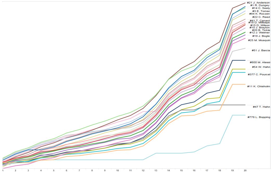 Dungey, or Anderson. This may have largely been because he had a crash on Lap 13 (perhaps getting tangled up with Lawson Bopping?), dropping him from