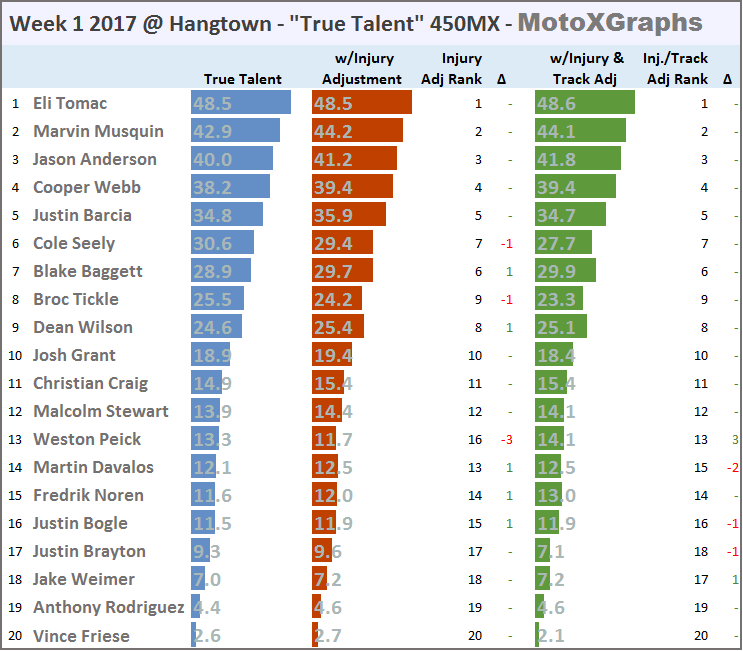 As usual, the updated 2017 Motocross Prediction puts the whole season in perspective, while the "This Week" rankings look at the riders' perceived ability (aka "true talent") as well as taking into account injuries and the riders' history at the upcoming track.