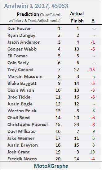 Trey Canard, of course, was off by the most as he DNS'd the Main Event. Also predicted in the Top 5 but falling short was Cooper Webb (finished 10th) -- but I think it was clear that the lack of "adjustment for first 450SX race ever", as mentioned in the predictions was a major factor. As he said in a RacerX interview, the big moment got to him a bit.
