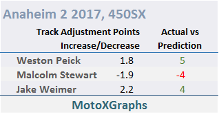 Since the Stadium/Track Adjustment is still a bit of a work in progress (The MX Book goes through it in detail, with encouraging conclusions), I highlight the major ones each week to see if the riders' finishing spots were better or worse at the Supercross stadium -- that is, in line with the prediction or not. There were 3 substantial Stadium/Track Adjustments for the 450's at Anaheim 2: