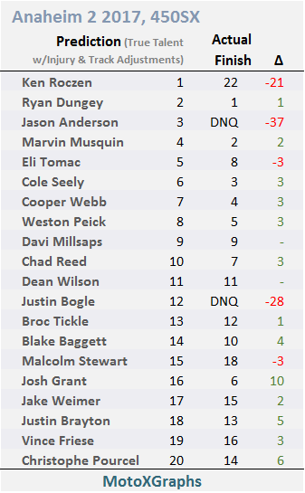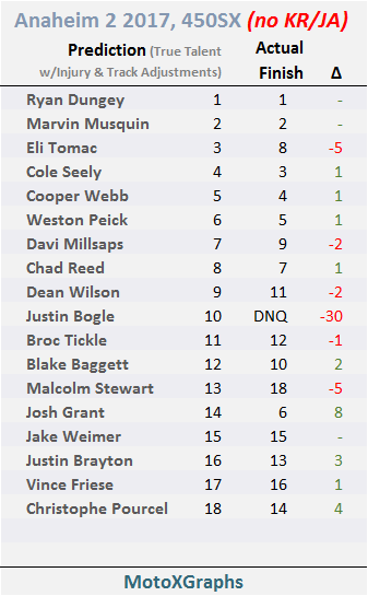 Only 2 riders were exactly right, 2 more were off by 1 spot, and another 2 were off by 2 spots. Deviations like Justin Bogle (predicted 12th but crashed out during his Heat Race) and Josh Grant (predicted 16th but finished well ahead of that, in 6th) wouldn't have been avoided if Roczen/Anderson had made it through the Main Event. Same is true for Eli Tomac, who only managed to finish 8th despite the absence of two likely Top 5 guys.