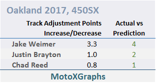 They are all in the correct direction and also around the same magnitude, which is simlar to last week and good news that the Track Adjustment is showing predictive value (even in Supercross, where the track layouts are not entirely consistent at any given venue from year to year).