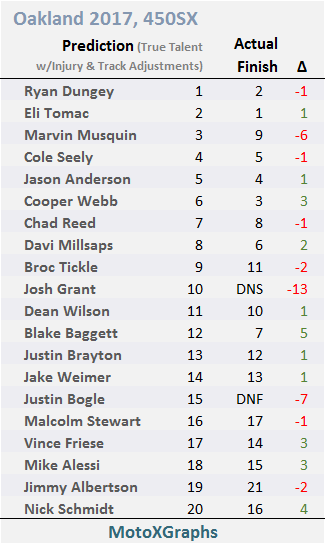 My bar of success for the This Week predictions is getting over half of the riders within 2 spots -- for Oakland it had 12 of 20 (and 12 of 19 if you excuse Grant's fluke crash/injury). If you relax the standards to within 3 spots, then it's 15 out of 20, or 75% of the riders predicted within 3 spots. While the most important prediction (1st Place) was off by 1 spot (Tomac was predicted 2nd), the rest of the field's projections were pretty well in line with what actually went down.