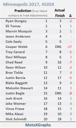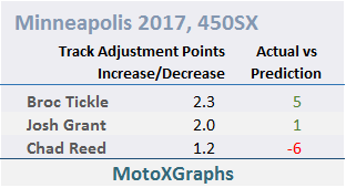 The next biggest adjustment, though not all that large, predicted Chad Reed to do 1.2 points better at U.S. Bank Stadium, but he did 6 points worse due to a crash.