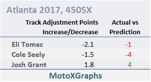 Since the Stadium/Track Adjustment is still a bit of a work in progress (The MX Book goes through it in detail, with encouraging conclusions), I highlight the major ones each week to see if the riders' finishing spots were better or worse at the Supercross stadium -- that is, in line with the prediction or not.
