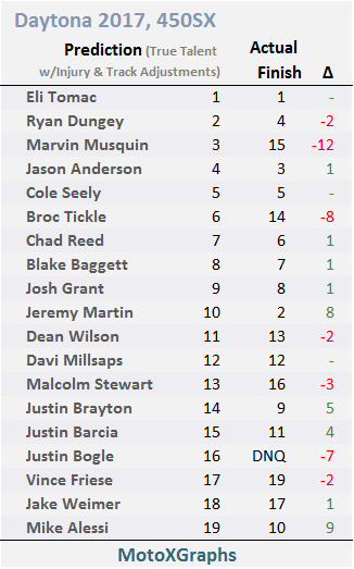 Only 3 were exact, but 8 more were off by 1 or 2 spots. That means 11 out of 19 were within 2 spots, which is decent but not great. Davi Millsaps being predicted exactly in 12th is a good one. Oh, and Eli Tomac at #1, once the Track Adjustment was included (though MotoXGraphs is far from the only place to predict Tomac to win Daytona). Not so good is Broc Tickle predicted 6th but finished 14th. Marvin Musquin was way off, but there were special circumstances with getting held up by Barcia's crash at the opening turn. Mike Alessi had the best day (10th) compared to his prediction (19th).