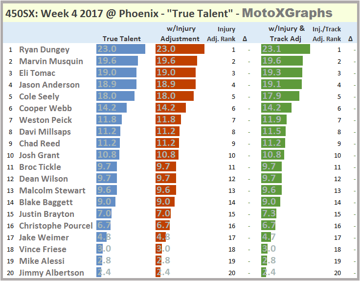 Dungey tops the list for the first time in 2017, and Marvin Musquin makes his first appearance as the leader of the Musquin/Tomac/Anderson/Seely group. Eli Tomac and Jason Anderson are nearly in a tie for 3rd, with Tomac getting the slight edge -- somewhat coincidentally, those were their finishing positions last year (Tomac 3rd, Anderson 4th). Tomac's 3rd in Phoenix followed a 7th place the week before in Oakland.