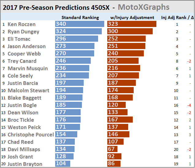 Eli Tomac gets dinged in points (but stays just ahead of Jason Anderson) based on recent injury history. Trey Canard, as we're all familiar with, has had trouble with injury and slips 2 spots in this ranking, to 8th. Justin Bogle has the largest negative effect from the adjustment, losing 4 spots down to 16th.