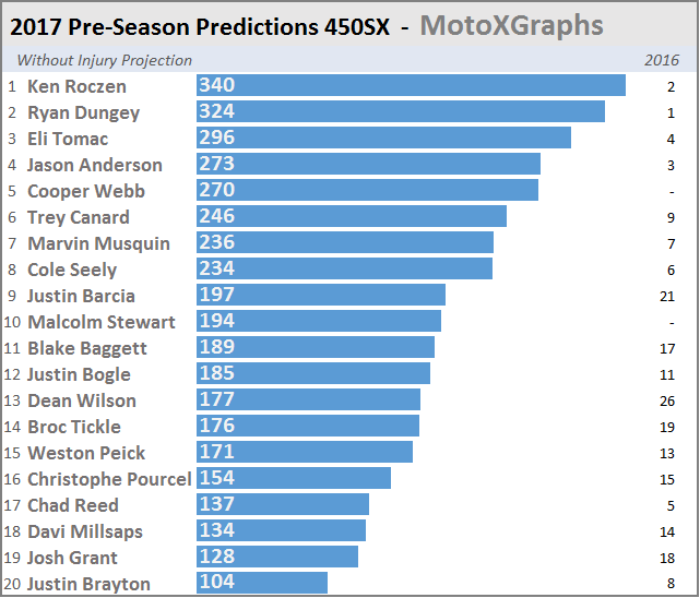 Now, to factor in the riders' injury history for a different perspective on who will finish where. The injury prediction is always going to be a very rough guide, but it is based off of races missed in both MX and SX for the past 4 years. Sometimes that is a trend and sometimes it's bad luck (this is discussed at length in The MX Book), so take these with a grain of salt.
