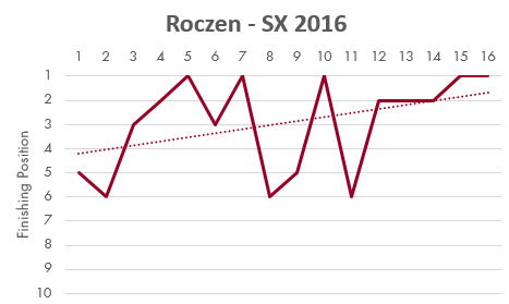 So now instead of just one main factor to consider -- Roczen's improvement -- there are three: Roczen's improvement, Dungey's injury, and Roczen's new bike. The numbers can't tell much about the latter two, though, so it's up to the viewer to make their own inferences about the effects from those. But the improvement expected by age is something that we can address. Starting with Supercross in 2016, while Roczen was not on the same level as Dungey on the season overall, Roczen did show improved results as the season went along: