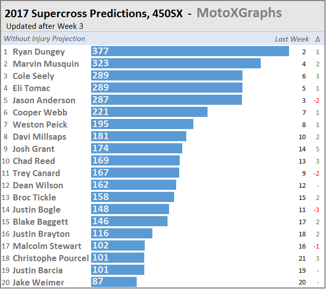 You might think that tied for 3rd is an extremely favorable prediction for Tomac, whose best finish so far in 2017 is 5th. The model, though, is taking into account his past performance, and while something is definitely bothering him (possibly still arm pump, who knows what else), if he overcomes that, he suddenly is the fastest non-Dungey rider based on recent history. Don't forget that Tomac capped off 2016 SX with a 2 / 2 / 3.