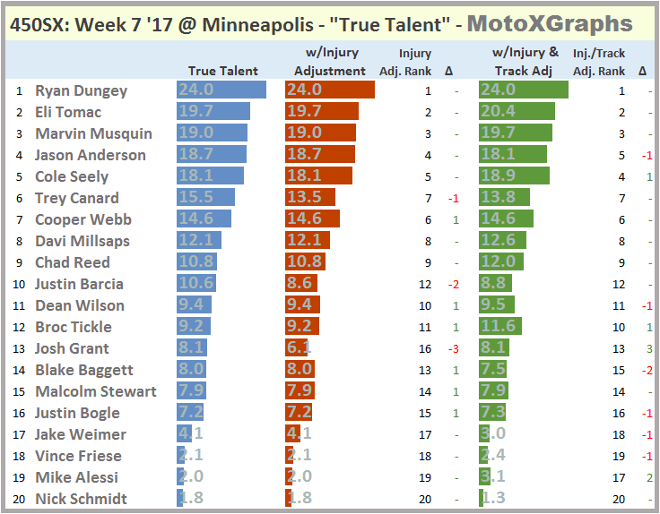 The Location Adjustment isn't really all that relevant this week, so take it with a HUGE grain of salt. Since no race has been run in Minneapolis for several years (in 2013, when it was in the Metrodome...and Dungey won), I'm using Ford Field in Detroit and Lucas Oil Stadium in Indianapolis as proxies. Not exact matches for the U.S Bank Stadium this week, but as close as it can get.