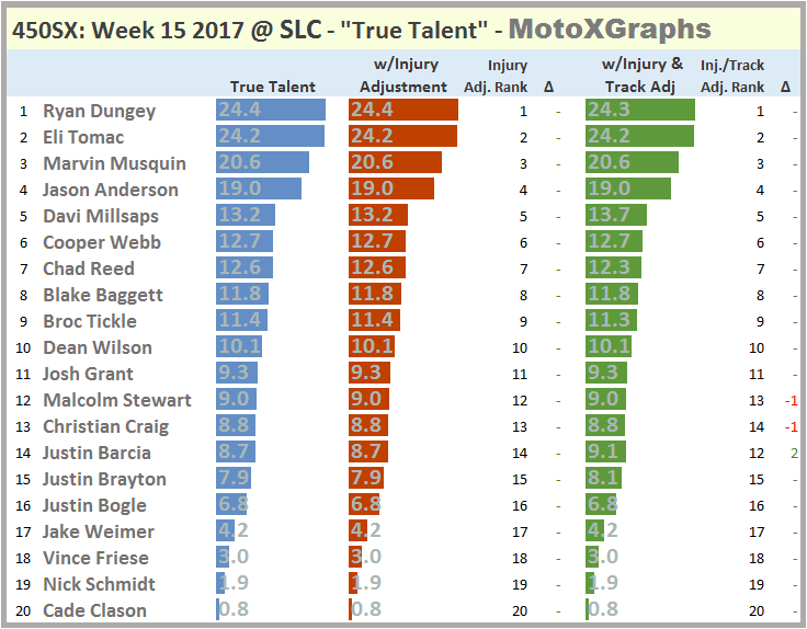 Again, it might seem like a surprise that Ryan Dungey is predicted ahead of Eli Tomac, but that is due to Dungey being much better than Tomac in each of the past 3 seasons. The Track Adjustment (minor) narrows the gap very slightly and is probably not meaningful considering it's been a few years since a race at SLC.
