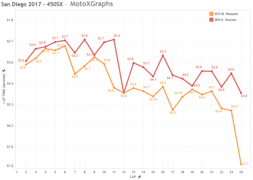 With Roczen and Dungey breaking away so completely from everyone else, I'd say it's a mark of success if any of your laps were on par with any of theirs. Musquin can at least claim that around 4 of his laps (I'd say laps 4, 9, 12, and 19) were pretty close to Roczen's: