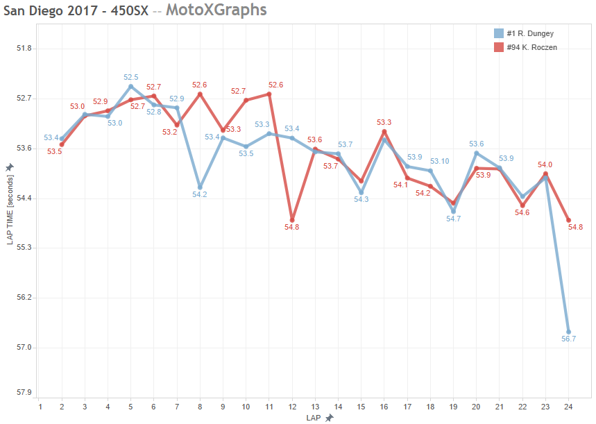 Instead, Roczen seemed to have a mistake in Lap 12 (I don't remember seeing that live -- went back to watch and it wasn't on screen nor was it mentioned), and Dungey narrowed the gap. From there, they were nearly equal (amazingly equal, actually) until Dungey's bobble while trying to make something happen in the final stretch, on Lap 24.