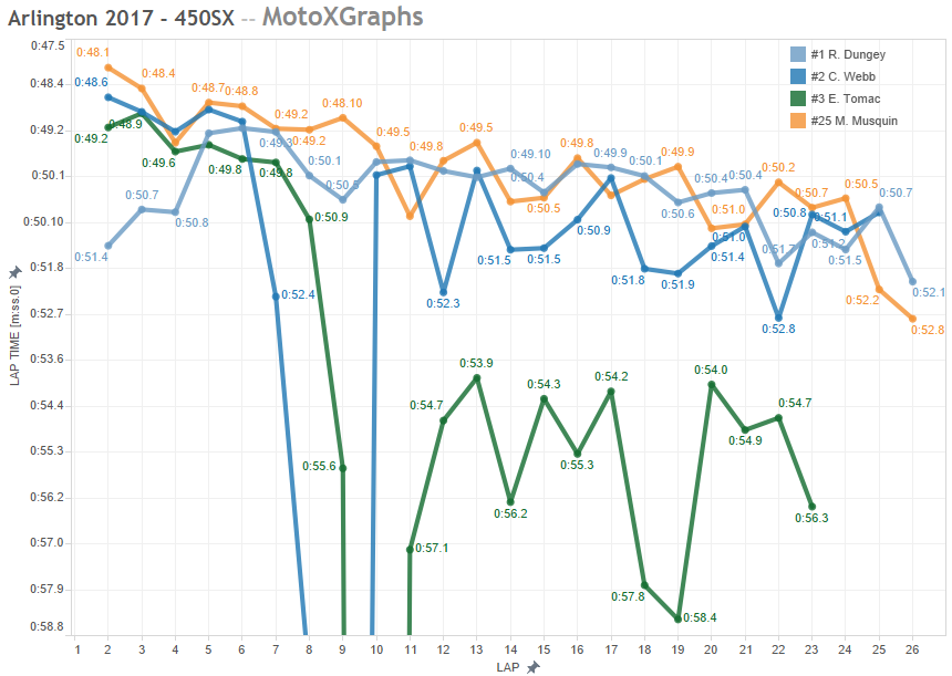 Based on what little we have to go on, Webb didn't appear to be going fast enough to catch Musquin, and Tomac didn't appear to be going fat enough to catch either. I stuck Dungey in that graph because it shows the he was actually gaining time on Tomac in laps 5, 6, 7, and 8 before Tomac had the crash and was forced to pull off. Maybe things change once the race opened up -- and the track seemed very one-lined, which could slow someone down by getting stuck behind another rider -- but from what we see, it may have been that Dungey could have caught Tomac.