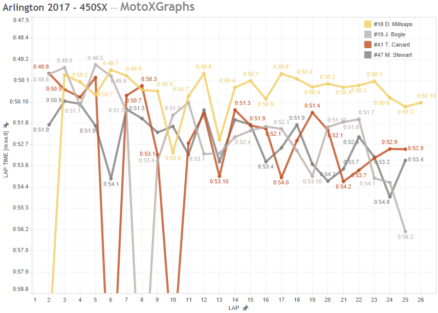 While rookie Webb had terrible luck with a flat tire, the other rookie Malcolm Stewart put in his first 450 Main Event without going down (as far as I can tell). That left him in 10th, his best finish. How did his lap times compare to those who finished around him?
