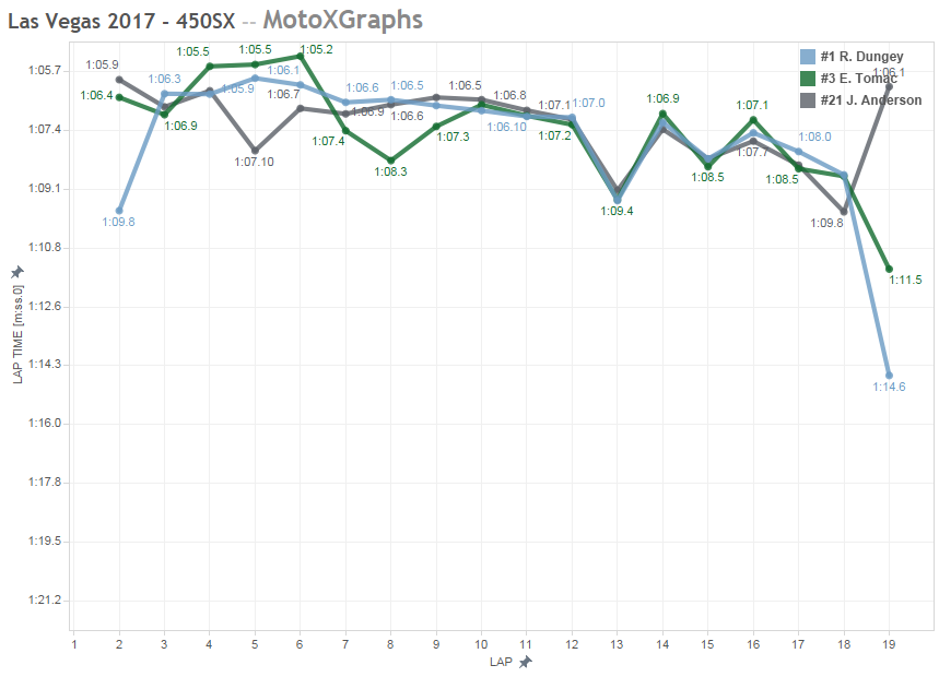 Whatever the case, it's amazing how close Tomac, Dungey, and Anderson rode for the entire second half of the race (save the last half lap), as you can see in that graph. In the laptimes tool below, add in Chad Reed, to see how he took advantage of the situation, making up a ton of ground in Laps 13, 14, and 15, right up until his collision with Anderson.
