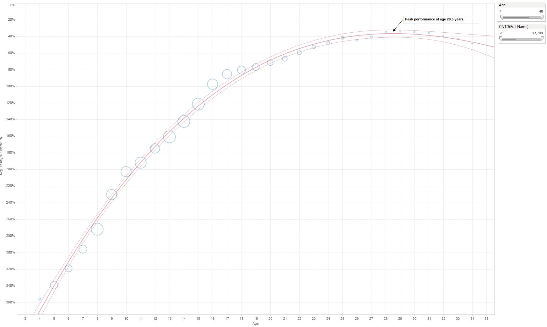 Let's get the inputs out of the way - Average Yearly % Overall is described more fully in What?, but in short it is a method to compare all riders of all ages across all classes and all qualifier levels. You would expect that, in general, as riders get older, their % Overall would follow a more-or-less parabolic curve, and it does. Age is simple, on the surface, in that it's the age of the rider during the season of the race (some error is introduced b/c we don't always have exact birthdays and some birthdays are during the season). The number of riders that competed at each age is represented by the size of the circle (hover over to see how many riders are at each data point).