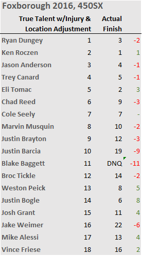 How did the "This-Week" predictions do for Week 15 in Foxborough? Not a great week, I would say, in terms of total number of spots off. Each of the previous 4 weeks had smaller discrepancies in total than the predictions for Week 15. And, the Foxborough predictions missed the winner as well as Eli Tomac moving up to #2. But, the predicted Top 5 were all actually in the Top 5, with Roczen, Anderson, and Canard off by only one spot: