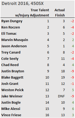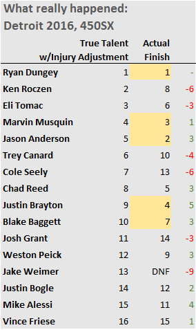 How did the "This-Week" predictions do for Week 11 in Detroit? That depends: did Ryan Dungey really commit an infraction worth a two-spot penalty? And should Justin Brayton and Blake Baggett take a hit on their performance because of what seemed to be totally random flat tires? Let's look at it both ways. First, the official results, comparing the True-talent prediction including the injury adjustment: