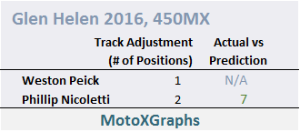 The 250 class had one major Track Adjustment, for Zach Osborne -- he was expected to finish 7 spots off his regular prediction. But, he finished 8th overall, which didn't match up with what was expected. Also, Matt Bisceglia had a large Track Adjustment, but he didn't end up riding and even the RacerX guys don't seem to know why (he left MAD Racing/Dirt Candy Suzuki but hasn't announced what's next).