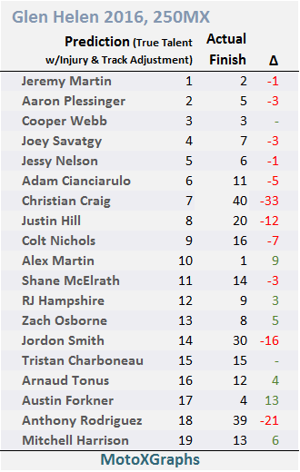 Glen Helen? A few big surprises, but overall the predictions did well again, getting the top 5 correct for the 450's (with a little help from Roczen's air