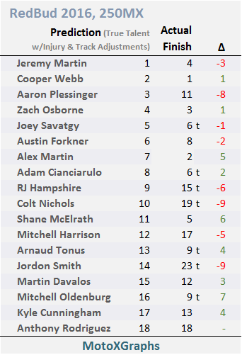 Justin Brayton was expected to earn 4 more points at RedBud than his prediction before the track adjustment, and he earned 3 more than predicted. Weston Peick and Phil Nicoletti were each expected to earn 1 fewer points than their predictions before the track adjustment, and both of them finished much worse at RedBud -- the actual result was in the correct direction, but was way higher than the prediction, so I'm not sure if that means the prediction was essentially correct or was way off....