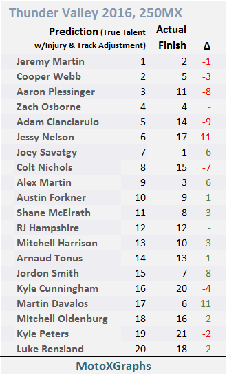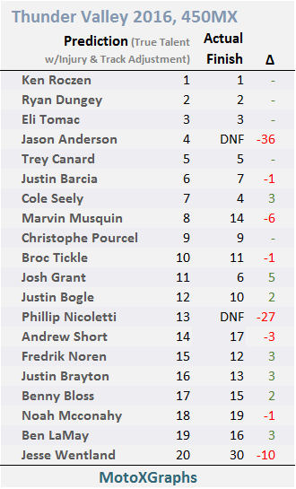 Of the Top 20, 10 picks were within 2 spots, and all but 5 were within 3 spots (and 3 of those 5 were Anderson, Marvin Musquin, and Phil Nicoletti, who had DNF's, for what it's worth).  Josh Grant and Cole Seely did better than expected -- both have had repeated success in 2016 that's outpaced their