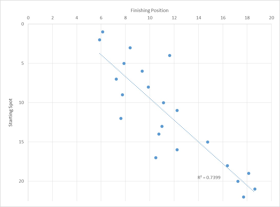 According to that R^2, where the riders emerge from the first turn explains about 74% of the variance in terms of where they finish the race. But to say that the starting spot "determines" the finishing position would be jumping to a conclusion. For one thing, the riders that get the better starting spots are often the best riders, so the real determining factor is the riders' skill level -- them getting the better position out of the first turn is just a by-product of their superior skill.