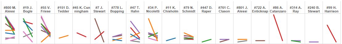 And finally, we can look at each rider on average over their races in 2016, which shows how well (or poorly) they started and how well (or poorly) they finished, with the slope of the line indicating how much they increased or decreased by the end of the race. Including only riders with 3 or more races in 2016: