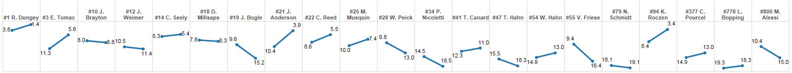 In addition to the correlation, we have some more to look at. How does this relationship map out for each rider? First, we can look at where each rider started and ended each race (in 2016). First the top half, according to average finish position:
