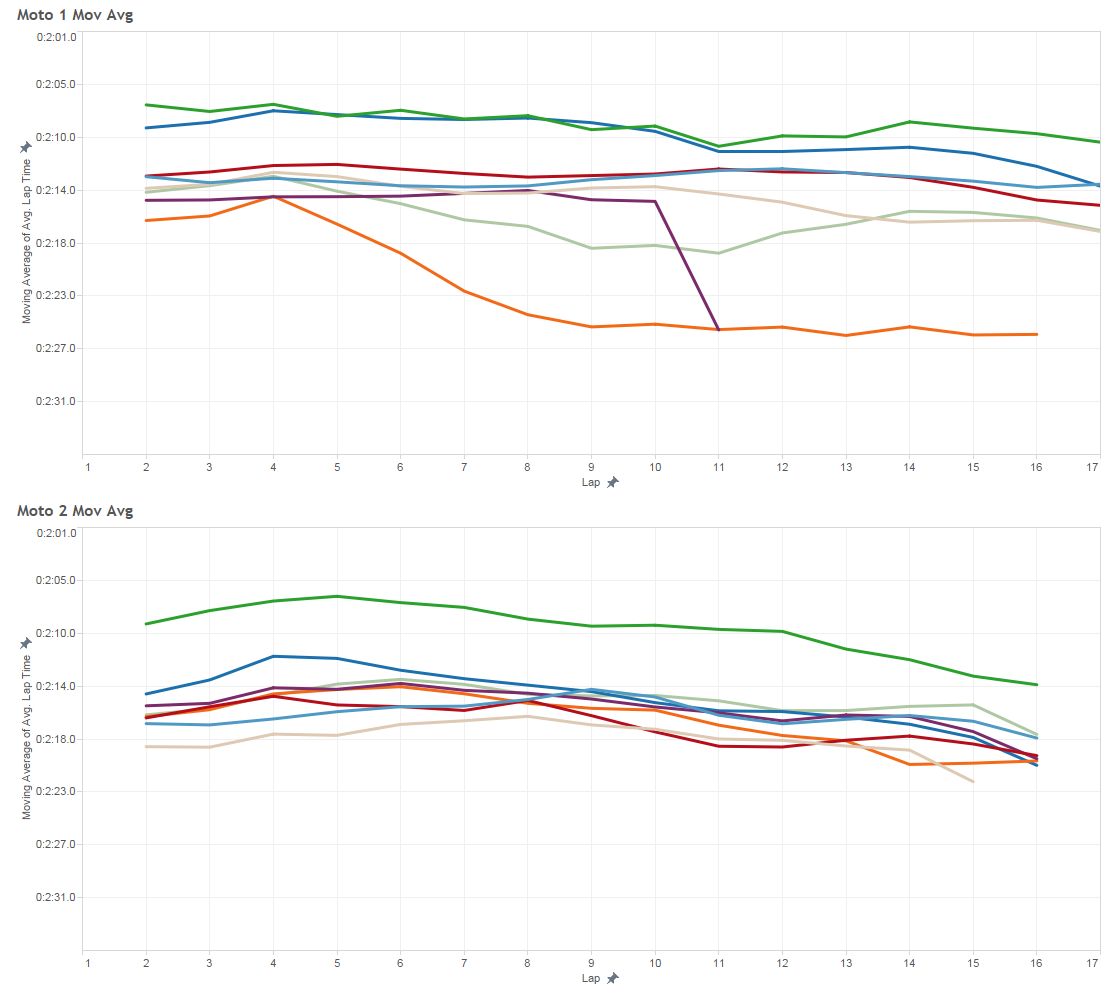 Just for fun, here's the two graphs in "moving average" form, just to smooth out the lines a little bit (though the accuracy is lessened). Gives a sense that even though Tomac and Dungey were trading fast laps in Moto 1, Tomac was getting the better of Dungey.