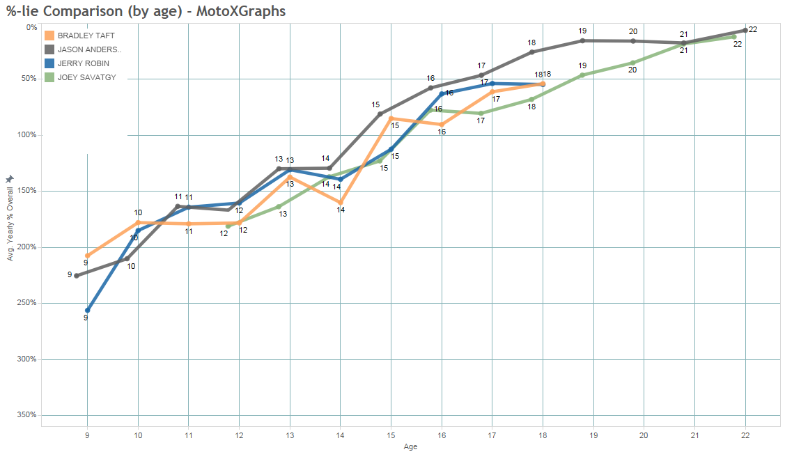 If I see an issue there, it's that his age-17 season was not that much better than his age-16 season, and his age-18 season was essentially at the same level as age 17.  For reference, we can compare Robin with Taft, and let's include Joey Savatgy and Jason Anderson as some other relatively young pros from 250 and 450: