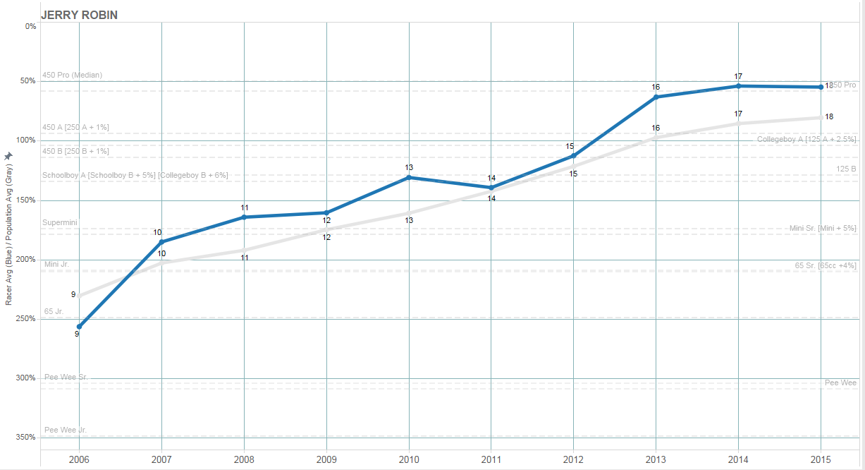 With his very good 250 results in Loretta qualifying and finals, Robin grades out as around the 10th best rider in the 250 amateurs this year.  Nearly up to par with Taft (who was around 5th in 250 amaterus and thus in the top 1%), Robin would be in the top 2% of the class.  From there, the prediction runs very similar to Taft's from the previous article -- except one big thing: Robin is riding in the upper 450 pro class, not the 250s.